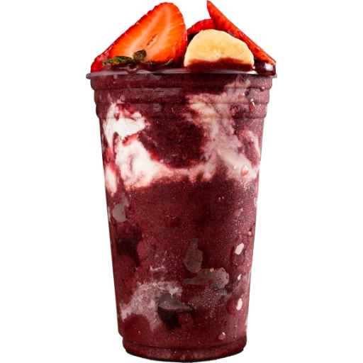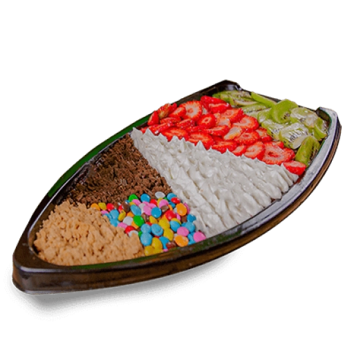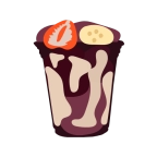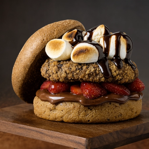 Um cookies tradicional com gotas de chocolate sobre uma camada de creme de avela e fatias de morango, coberto com marshm... Ver completo