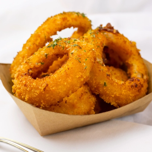 500g de anel de cebola empanado e frito, acompanha molho barbecue