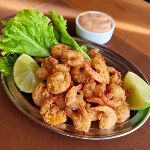 400g de camarão médio branco sem casca, empanado, acompanhado de maionese caseira e limão.