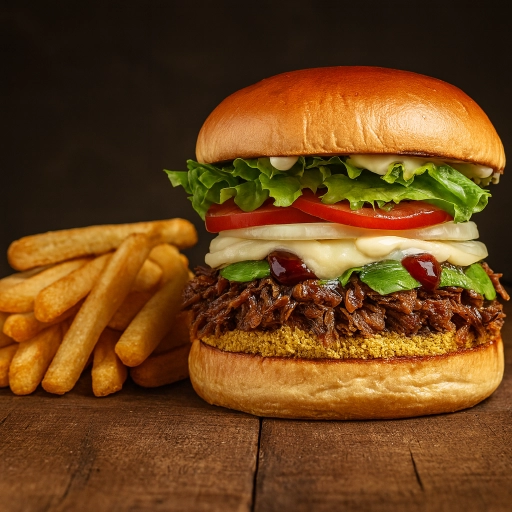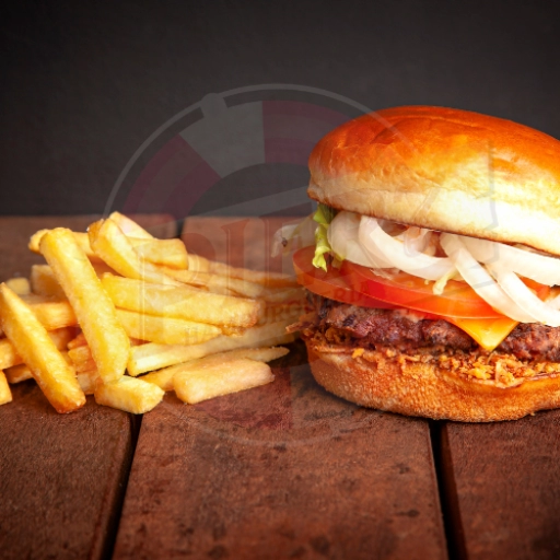 Um hamburguer de pura carne bovina, coberto com uma fatia de queijo cheedar derretido, anéis de cebola fritos e crocant... Ver completo