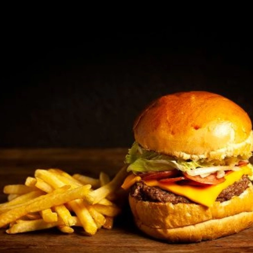 Um hambúrguer de pura carne bovina, coberto com uma fatia de queijo cheedar derretido, tiras de bacon crocante, cebola ... Ver completo