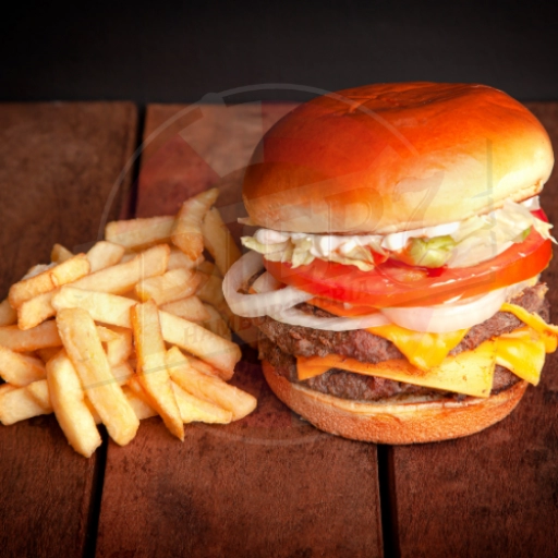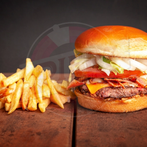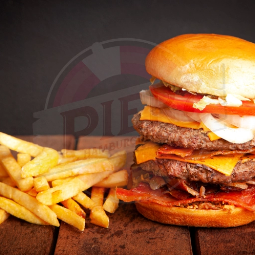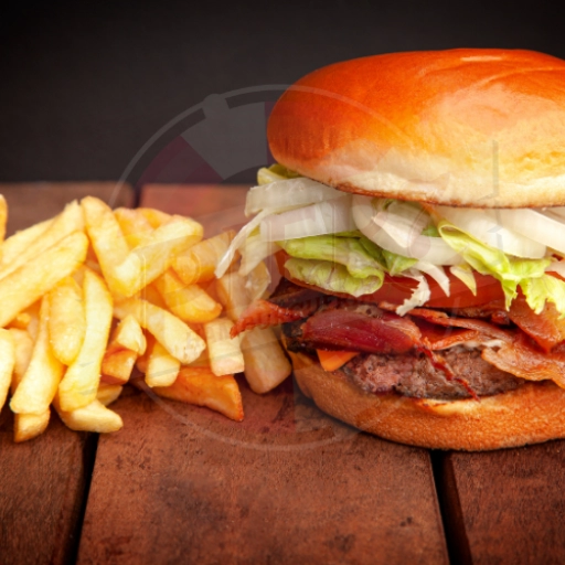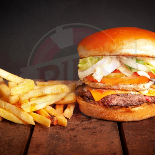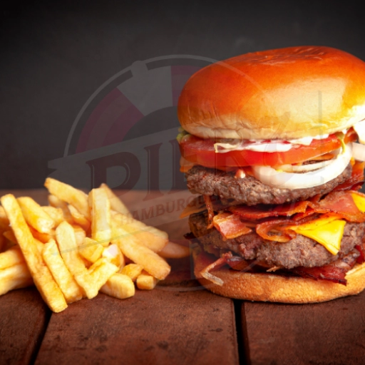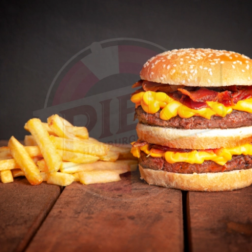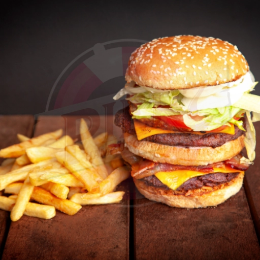 Dois hambúrguer de pura carne bovina, coberto com duas fatias de queijo cheedar derretido, com tiras de bacon crocante,... Ver completo