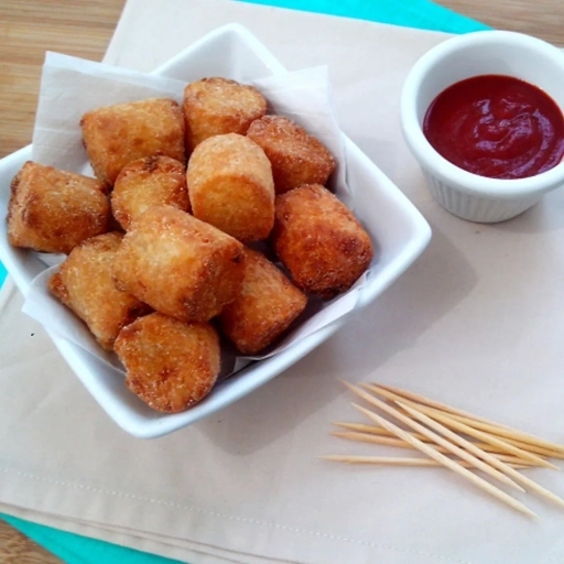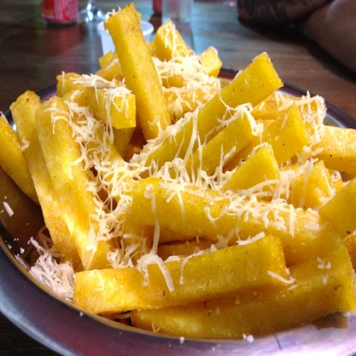 500g de Polenta frita, coberta com queijo mussarela ralado e cebolinha verde.