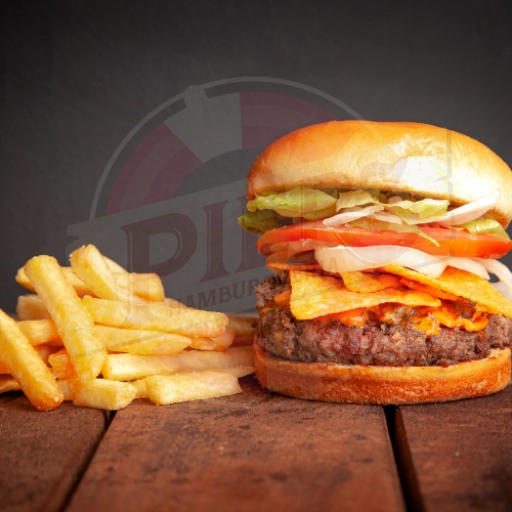 Um hambúrguer de pura carne bovina, coberto com uma fatia de queijo cheedar derretido, tortillas crocantes, molho apime... Ver completo