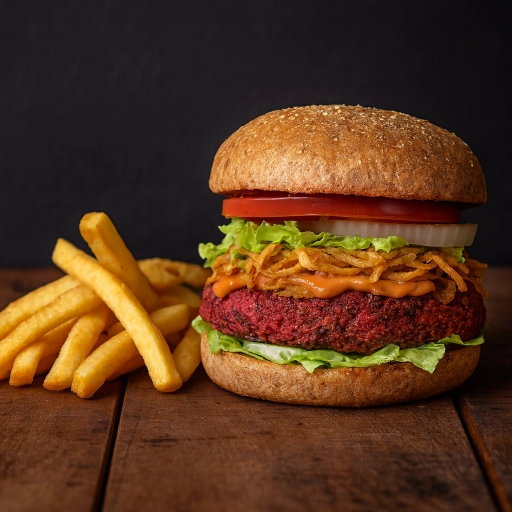 Um hambúrguer de lentilha com beterraba e especiaria, cebola crispy, onion ring, molho barbecue, maionese, catchup, ceb... Ver completo
