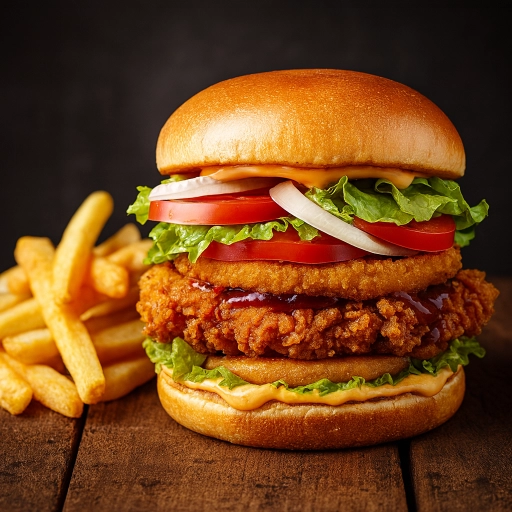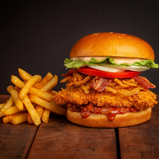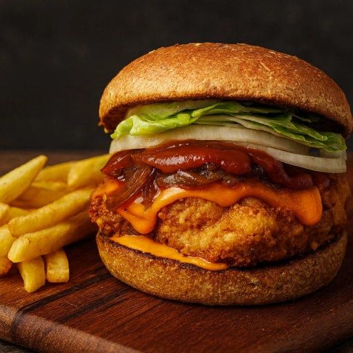 Um hamburguer de pura carne bovina, coberto com uma fatia de queijo cheedar derretido, anéis de cebola fritos e crocant... Ver completo