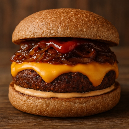 Um hambúrguer de pura carne bovina, coberto com uma fatia de queijo cheedar derretido, sobre uma camada de cebola crisp... Ver completo