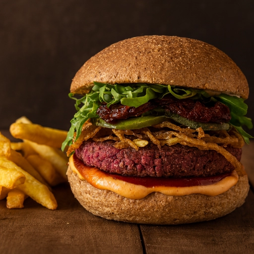 Um hambúrguer de lentilha com beterraba e especiaria, sobre uma camada de cebola cryspi, coberto com rúcula fresca e t... Ver completo