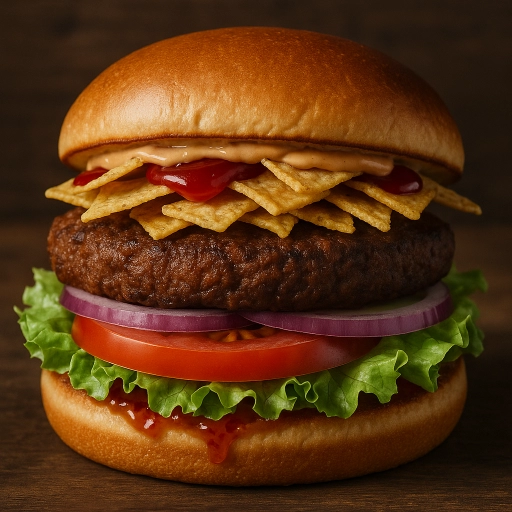 Um hambúrguer de pura carne bovina, coberto com uma fatia de queijo cheedar derretido, tortillas crocantes, molho apime... Ver completo